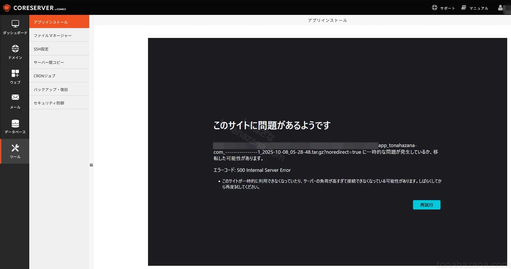 ダウンロードボタンを押してもバックアップファイルのダウンロードが開始されることなく500エラーが表示され、1~4時間ほどの間をおいて「再試行」を3~4回行ったが改善しなかった。