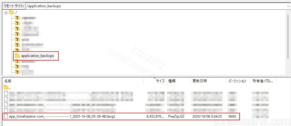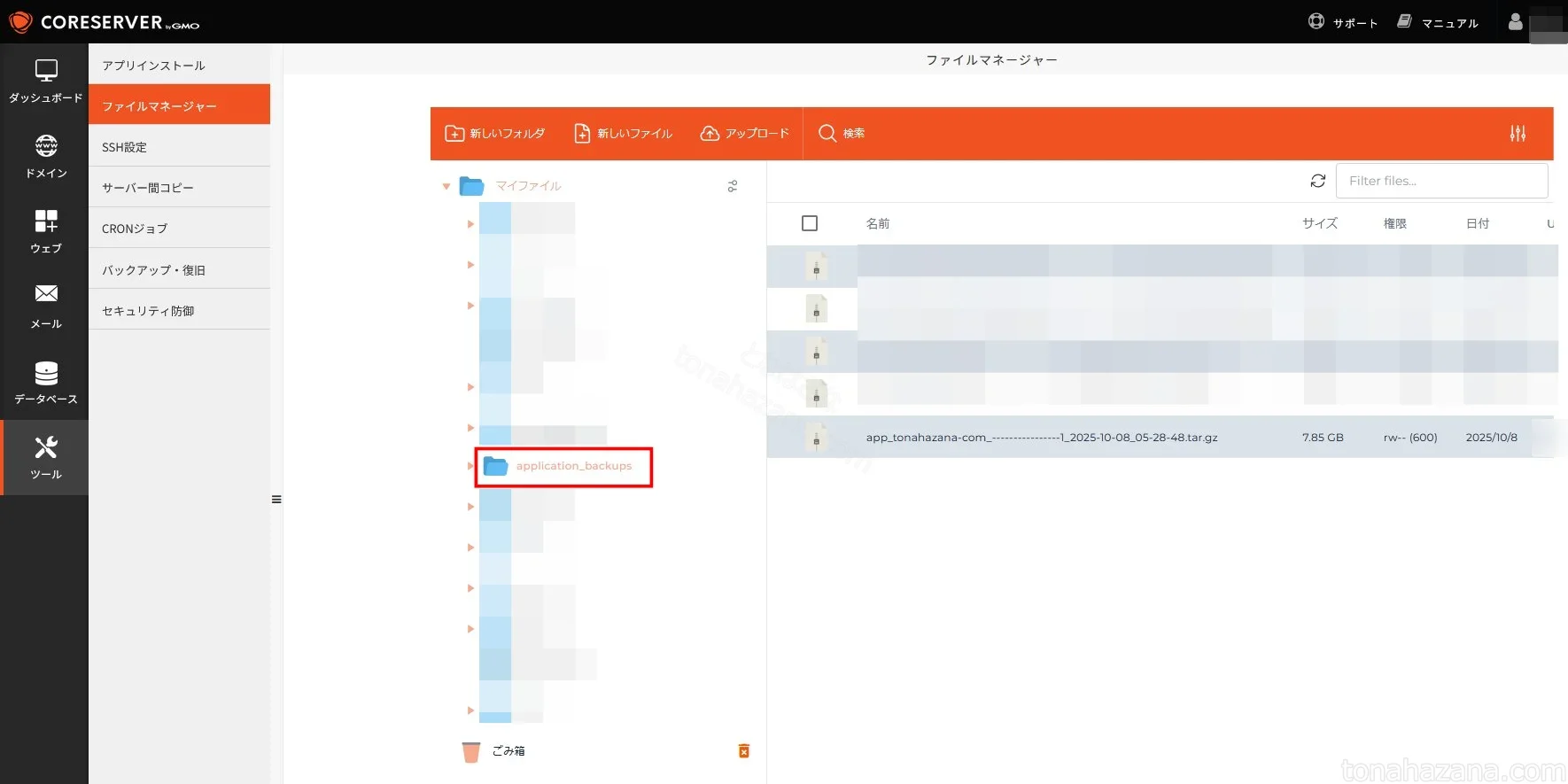 コントロールパネルの「ツール>ファイルマネージャー」からだと、「マイファイル>application_backups」となっていた。