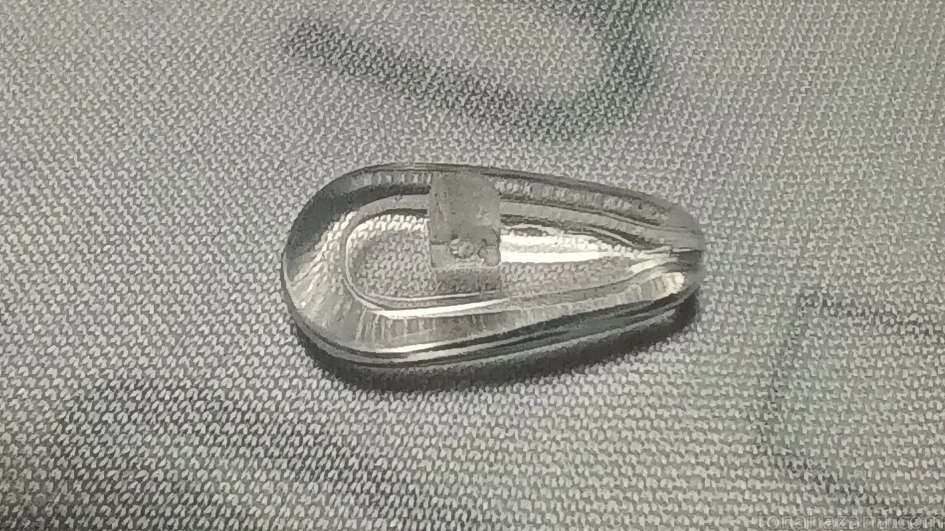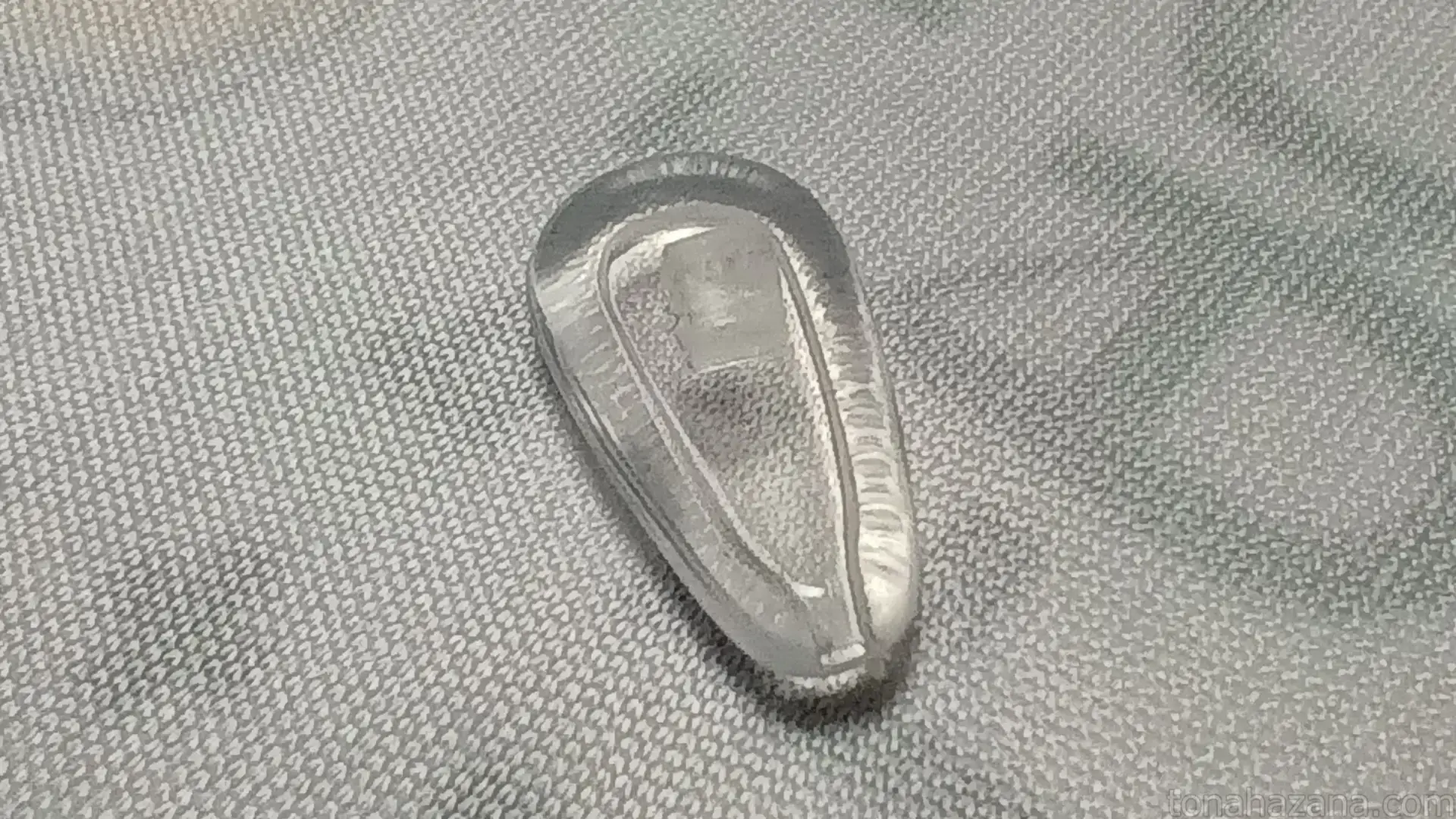 鼻パッドは、留め具部分までプニプニ柔らかいシリコン素材。中が空洞になっているしずく型で、先端に穴が空いている。