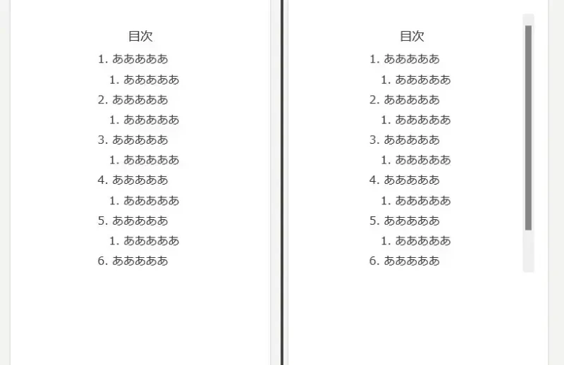 「スクロールバーを常に表示する」がオフだと、目次がスクロール可能な場合でもマウスポインターが目次エリアにない場合はスクロールバーが表示されないため、スクロールの可否を認識しづらい。