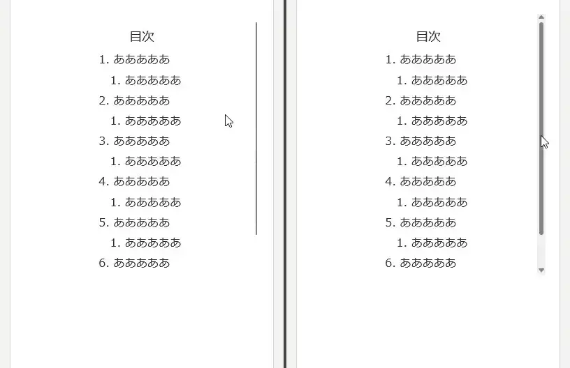 目次エリアにマウスオーバーしているとスクロールバーが隠れているあたりに細い縦線が表示される。スクロールバーの位置にマウスオーバーするとスクロールバーが表示される。
