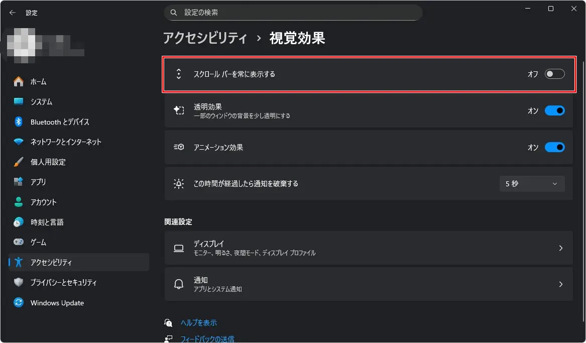 Windows11には「スクロールバーを常に表示する(オン/オフ)」という設定がある。