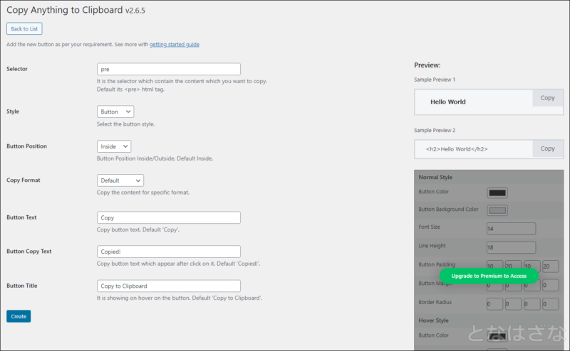 プラグインをインストールして有効化すると、デフォルトで「pre」という設定が有効になっている。これは、HTMLの「pre(整形済みテキスト)」タグにコピーボタンを追加する設定。