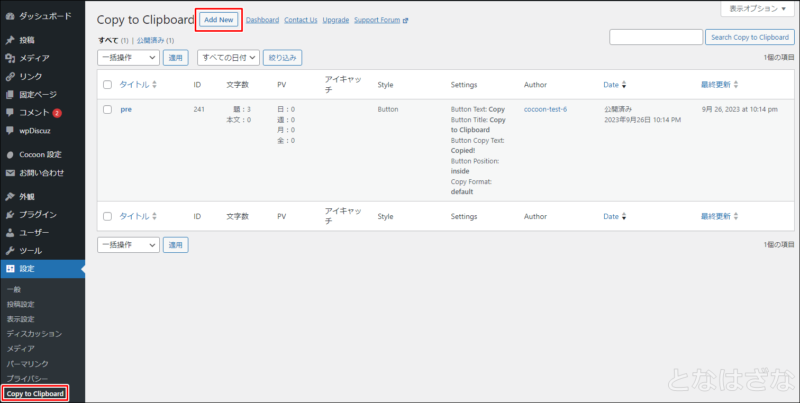 コピーボタンの新規作成は、設定画面上部の「Add New」から。
